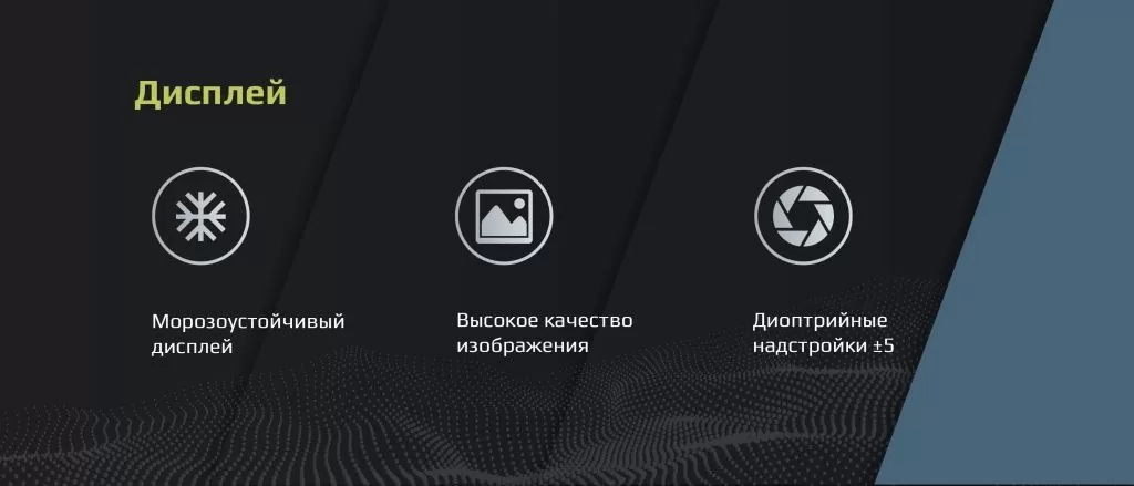 Окуляры оснащены морозоустойчивыми OLED-дисплеями диагональю 0,39 дюйма, которые транслируют цветное изображение в HD-разрешении. Доступны гибкие настройки яркости, контрастности и диоптрийная регулировка для каждого окуляра в диапазоне ±5 дптр.
