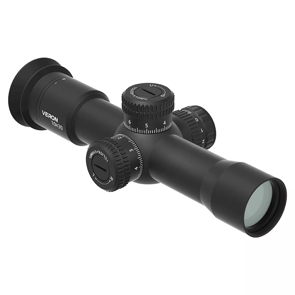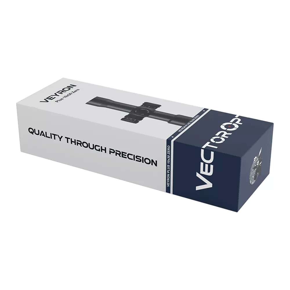 прицел Vector Optics 30 мм SFP Veyron Plus 10x30 Zero, руководство пользователя, салфетка для чистки, пластиковый гаечный ключ, откидывающийся колпачок, резиновые наглазники, пара 30-миллиметровых колец Weaver, гарантия.