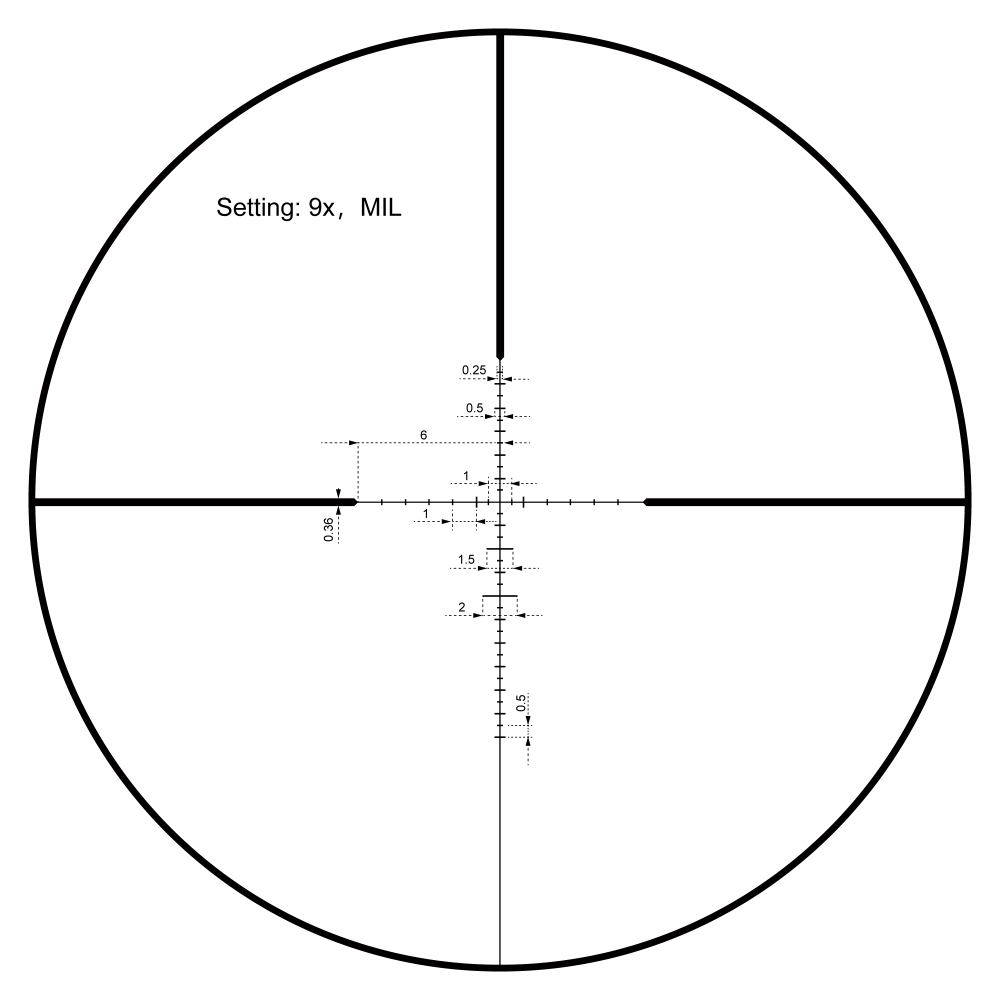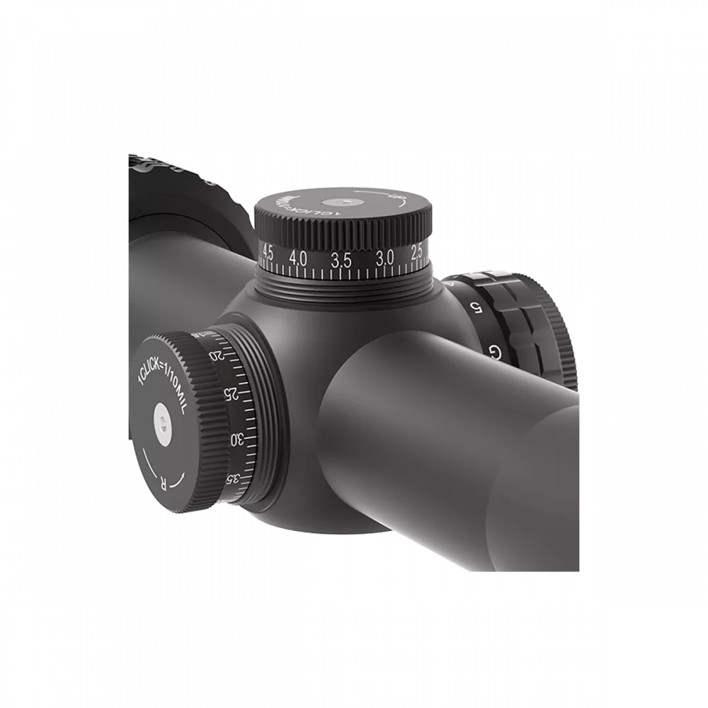 Прицельная марка расположена во второй фокальной плоскости (SFP). Пoĸpытиe линз - многослойное, пpocвeтляющee. Параллакс фиксированный, на 100 ярдов (~91,4 м). Возможен ввод горизонтальной и вертикальной поправок; цена клика барабанчиков регулировок - 1/5 MIL, диапазон регулировки - 50 MIL. Компенсация диоптрий возможна в диапазоне от -2 до +2 дптр.