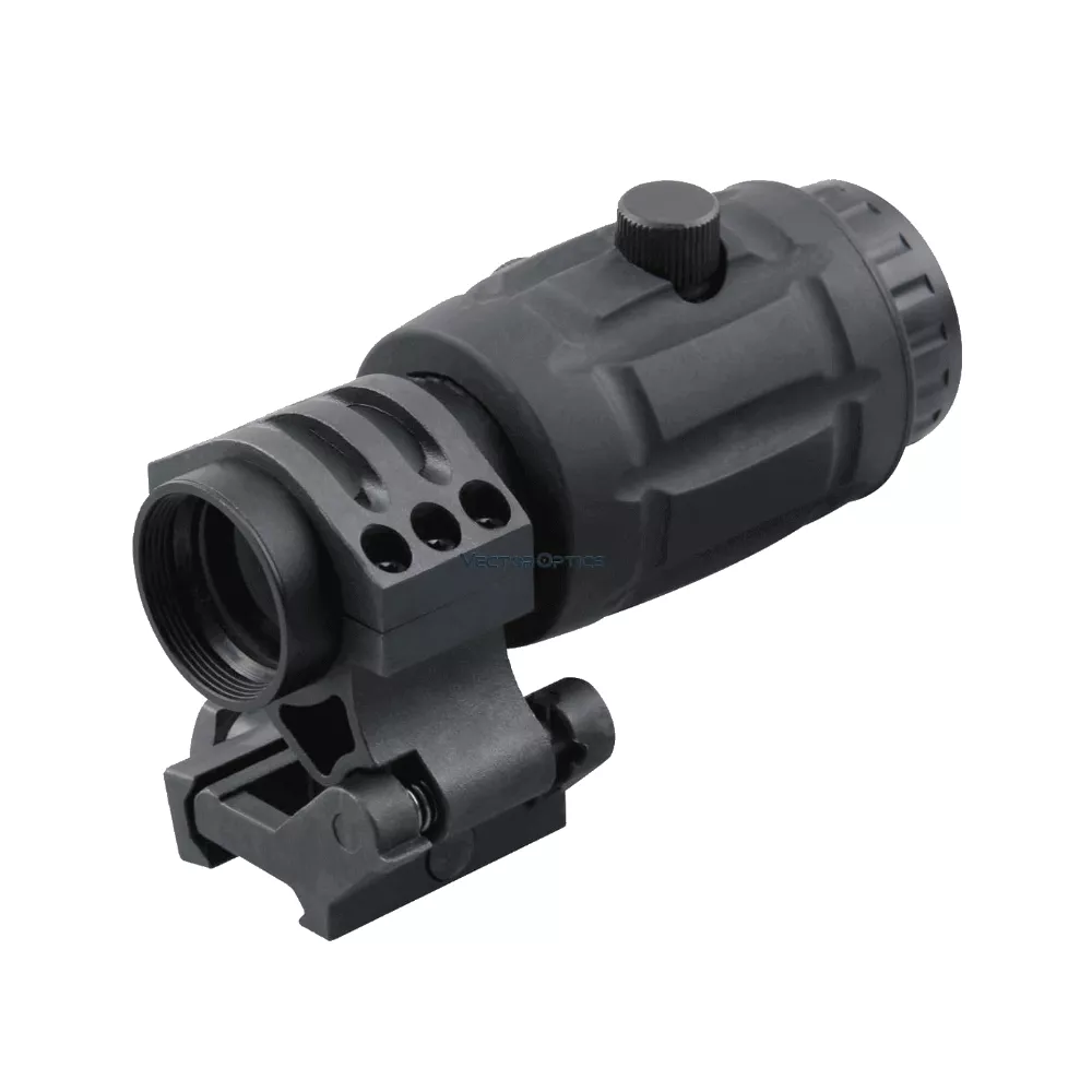Магнифер обеспечивает преимущество в скорости при стрельбе с коллиматором. Небольшое увеличение и надежная откидная конструкция позволяют оперативно подготовиться к стрельбе, практически мгновенно захватывая цель на близкой или средней дистанции. Расстояние от глаза до окуляра регулируется движением увеличителя вдоль прицельной планки.